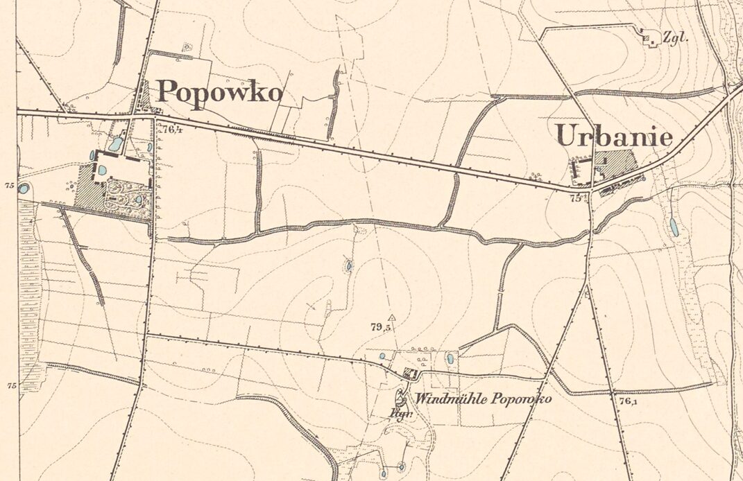Na starych mapach z lat 1848–1879, między Popówkiem a Urbaniem, widnieje osada młyńska oznaczona jako Młyn Popówko – Windmühle. Obok wiatraka i zabudowań młynarza pojawia się tam także znak krzyża. To właśnie w tym miejscu, na rozwidleniu dróg prowadzących do Urbania i do Zagaja, stanęła ceglana kapliczka, przy której zbierali się mieszkańcy okolicznych wsi na nabożeństwa majowe. Najbliższy kościół był przecież w Szamotułach, więc dla wielu ludzi to właśnie tu biło serce religijnego życia. Kapliczka była najprawdopodobniej poświęcona Matce Boskiej. Jej figurka nie dotrwała jednak do naszych czasów – dziś we wnęce stoi tylko drewniany krzyż przyniesiony przez kogoś z domu.